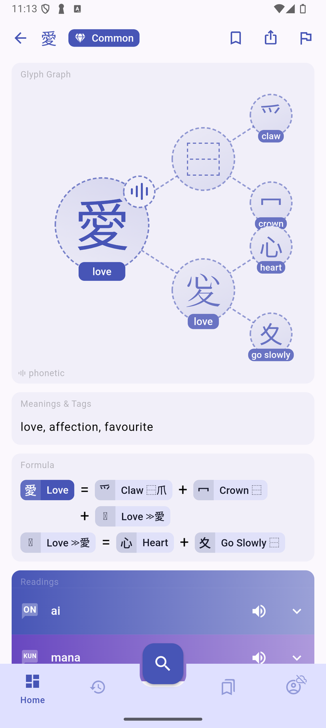If you click on the kanji, you will see more detailed information. Explore the components and structure of the kanji by viewing its glyph graph, which breaks down each part of the kanji, and listen to its readings to learn pronunciation.