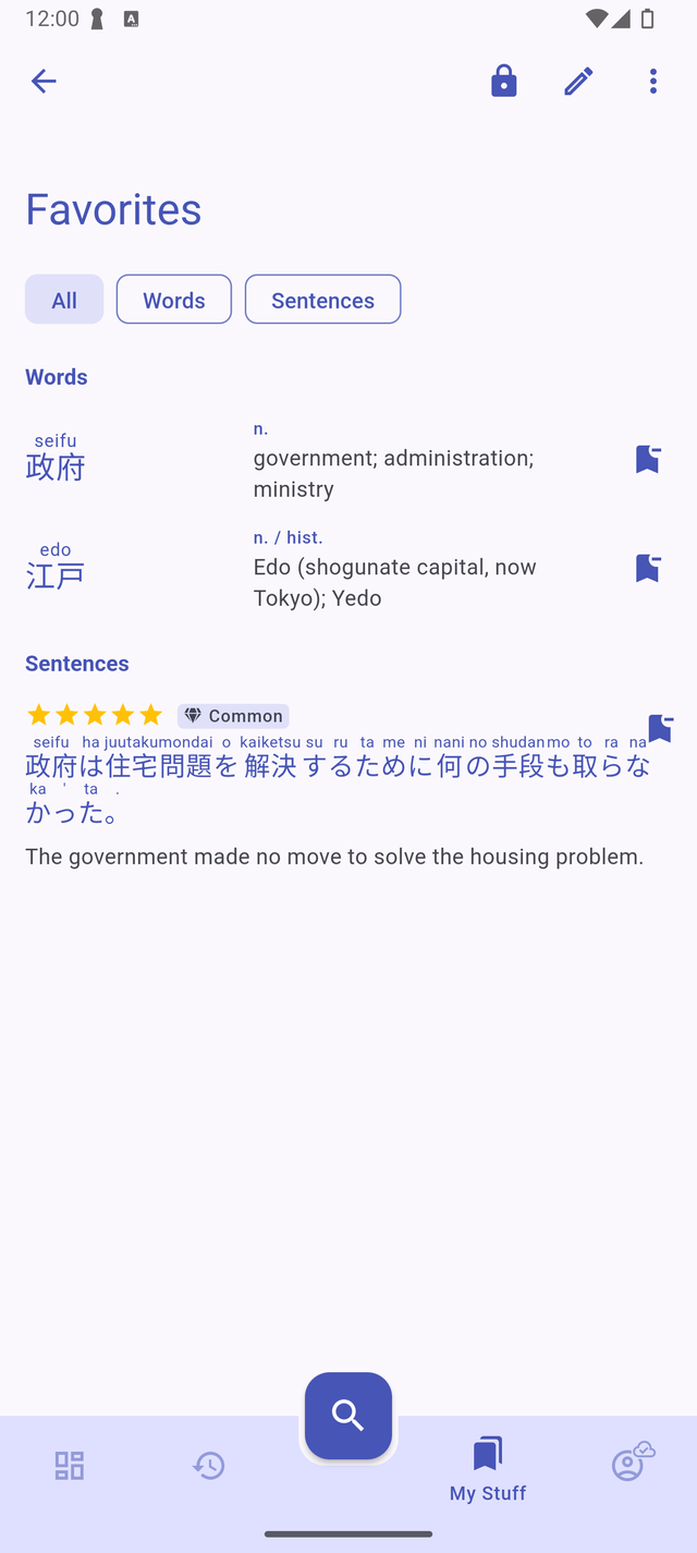 - When you find a kanji, word, or sentence you want to save, tap the bookmark icon next to it.