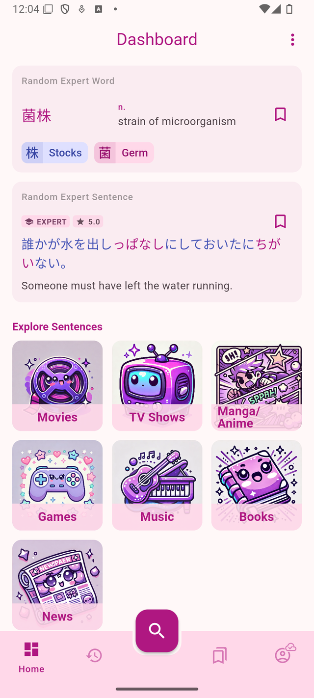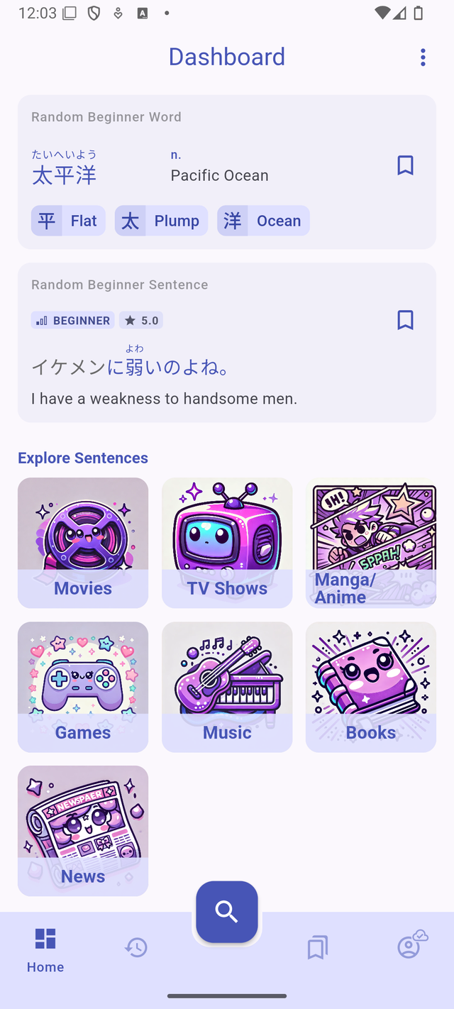 - History: Access your history to review words, kanji, or sentences you've previously studied.