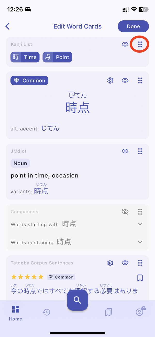Easily rearrange the order of the cards on your dictionary. Whether you prefer to see meanings, radicals, or examples first, you can organize your cards to match your study style. Use the drag handles to reorder the cards on the page.