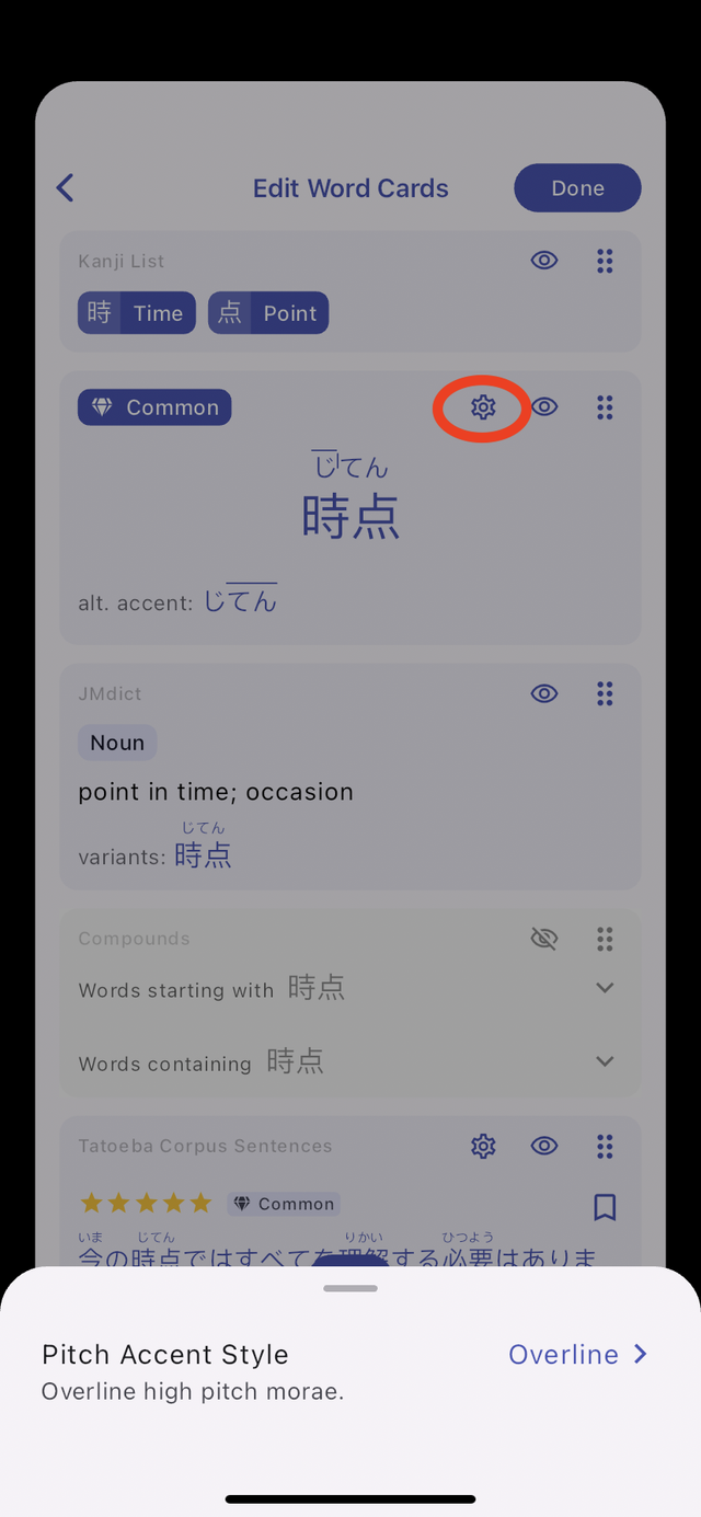 Edit the settings of each card by tapping on the settings button. A sheet that is similar to the one on the Settings page will appear.