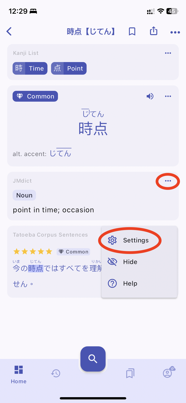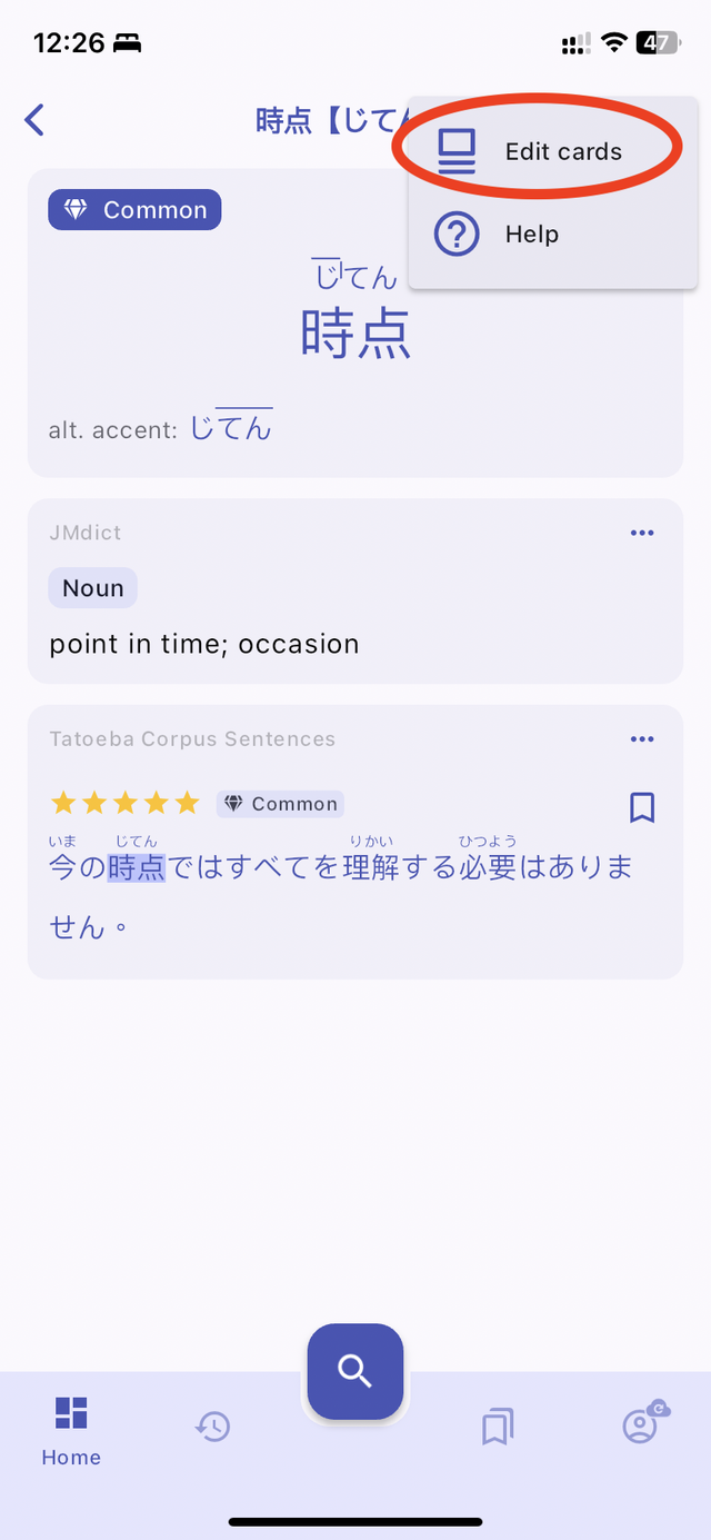 Open any kanji/words in the dictionary and tap on the "Overflow" icon at the top of the page. Then click "Edit Cards."