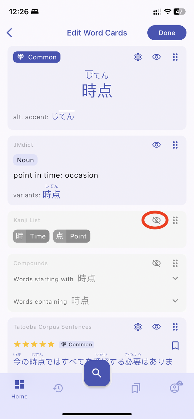 You can choose to hide the cards that you are less focused on, creating a cleaner and more tailored learning interface. Use the visibility toggles to show or hide specific cards.