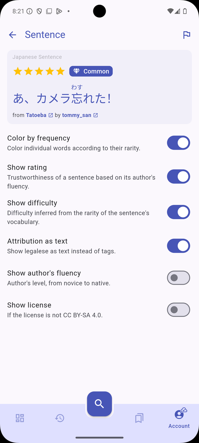 - Sentence Translations: Shows the translated sentence in the language of your choice. The translation is sourced from the Tatoeba Corpus, which is a collection of sentences and translations contributed by users worldwide.