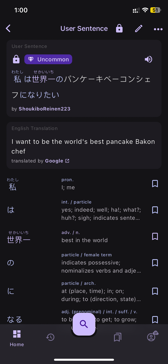 If the sentence you input isn't in our database, it will be stored as user-created sentence. Here's some examples of sentences we just created: